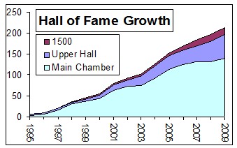 Totals are as at the end of 2009, when there were 1556 Marilyns, including Baystones. The 'Last' column shows the number of new Marilyns added last year or, if that is unknown, the year of the last recorded new Marilyn. Where totals are equal, the first to join the Hall of Fame is listed first.